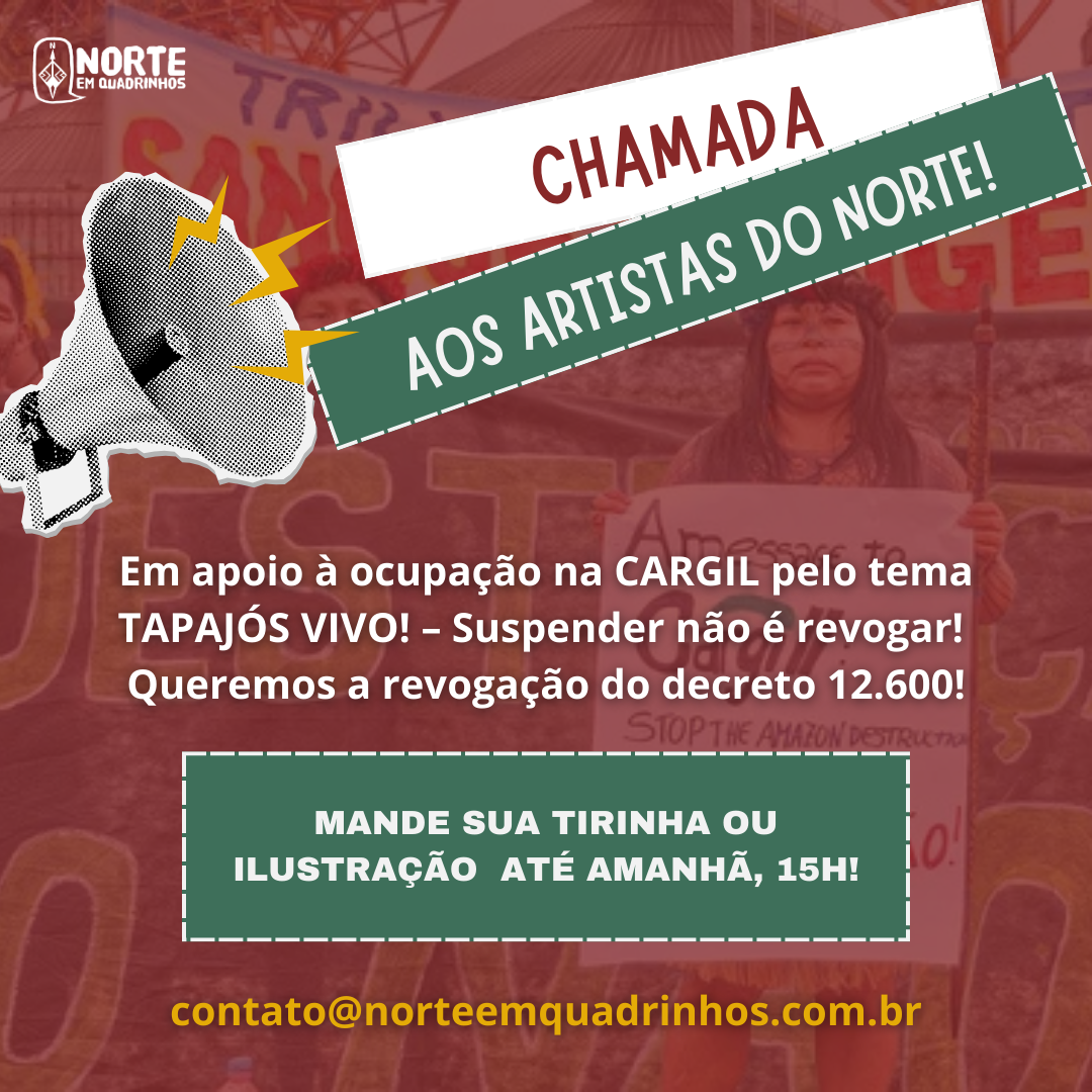 O Norte em Quadrinhos convida ilustradores, quadrinistas e artistas visuais a participarem de um post coletivo em apoio à ocupação na CARGILL, tendo como eixo o tema “TAPAJÓS VIVO! – Suspender não é revogar! Queremos a revogação do decreto 12.600”.