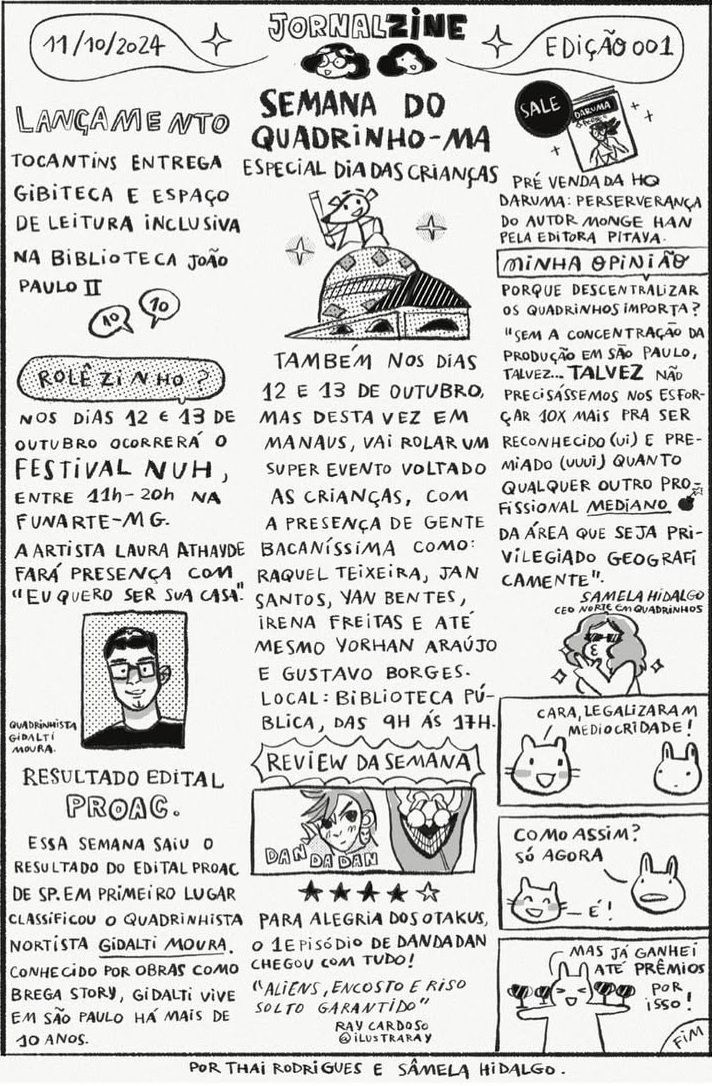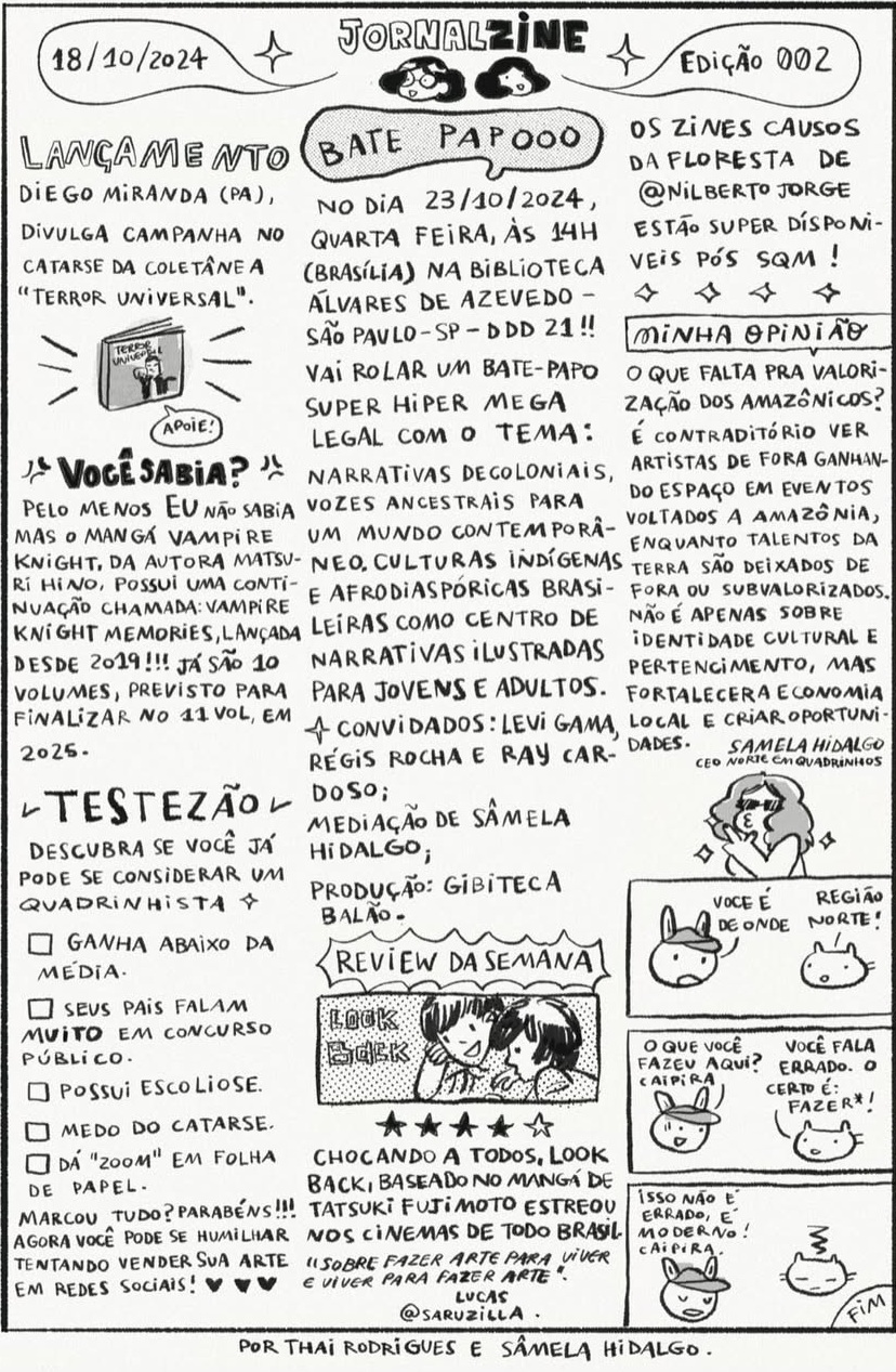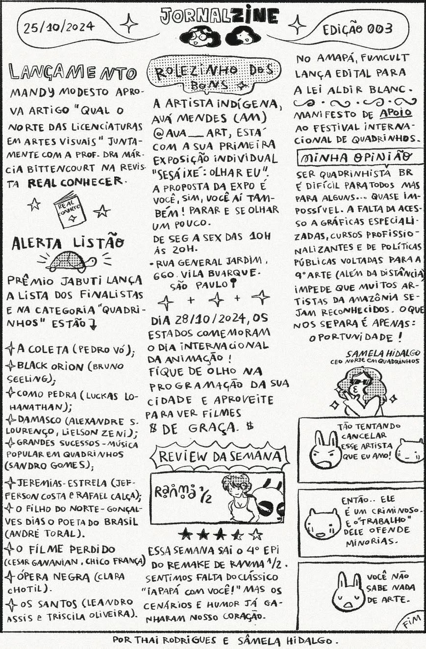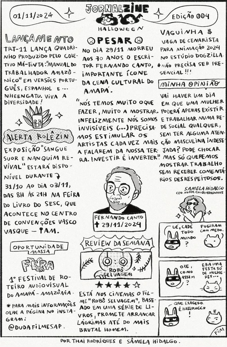 O JornalZine é um projeto informativo idealizado pela quadrinista amapaense Thai Rodrigues, com colaboração de Sâmela Hidalgo e publicado nas redes do Norte em Quadrinhos. Em formato de zine digital, reúne semanalmente novidades do universo dos quadrinhos da região Norte, como notícias, lançamentos, eventos e projetos autorais. Mais do que um boletim, o JornalZine valoriza e dá visibilidade à produção independente nortista, ao mesmo tempo em que registra e documenta a cena regional.