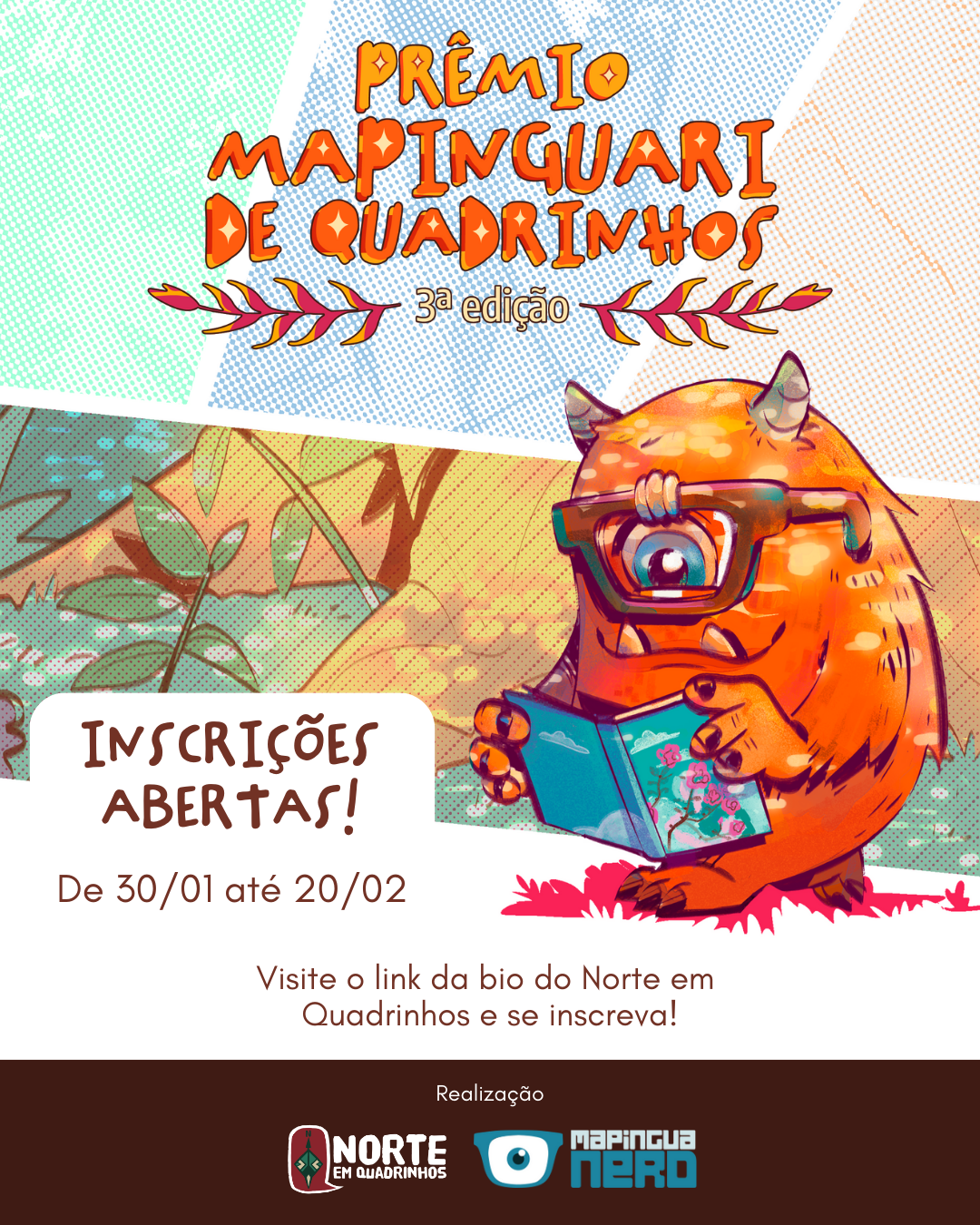 O Prêmio Mapinguari abriu as inscrições para a sua 3ª edição e convida artistas, roteiristas, ilustradores e coletivos de quadrinhos da região Norte a enviarem seus trabalhos até o dia 20/02. A nova edição, com identidade visual assinada pelo artista amazonense Dylan Ranna, chega com a proposta de ampliar ainda mais a participação de criadores e fortalecer a cena local.